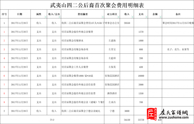 武夷山四二公后裔首次聚会费用明细表