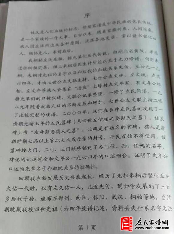 我桐柏左氏先祖,据先辈们历代传说,由湖北省黄陂、孝感迁往桐柏定居,祖上来桐后因生计所迫,以至于无力修谱,何时来桐,来桐时先祖的名字以及和后代的血统关系失传,至公元一九六四年,才由七世公左文联主持,七世公左文林、左文斌、左文相、左文年等族人会集在“老庄”上壕村左文年家,有文年公根据先辈们的口传叙述,文联公记录整理,一修了左氏简谱。一九八九年随着我族人口的不断发展和增加,七世公左文联主持二修了比较完整的族谱。二000年,我们在长冲左氏墓地发现了一清朝光绪七年的左氏墓碑(系四世左佑相之妻彭氏之墓),该墓碑上书“左母彭老孺人之墓”,此碑是有功名的官碑,孺人是清朝时期七品以上官职夫人或母亲的封号,平民百姓不得使用。该墓碑按大门、二门、三门顺序铭记了各门侄、孙、侄媳的名字。碑记的记述完全和文年公一九六四年的口述吻合。证明了文年公口述的先辈名字和血统关系的准确性。