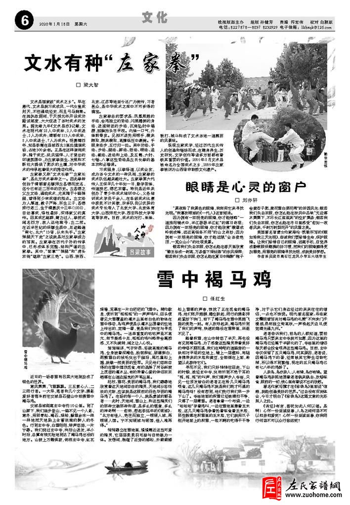 3、左家拳的文学价值 。 在左家拳的形成过程中,它既传承了中华武术的精髓,也体现了竞技体育的发展轨迹,同时也见证了江湖纷争的混乱和商业由盛到衰的社会背景,最可喜的是它还记载了当时许多关于文水的民间传说、风俗习惯等。而作为左家拳的创始人左昌德,因其在行镖的三十多年江湖风雨历炼中,武德高尚,武功高强,诚信待人,以拳会友,以功服人的行事作风,在民间留下了许多关于他的传奇故事。如在京城:踢死霸道马、搭救贫弱女、惩治恶社首;在保镖途中:功服老道、力胜方文、智取路侠、拳打歹徒等这些传奇般的经历在民间广为流传,它对民间文学的创作提供了不可多得的史实与依据。