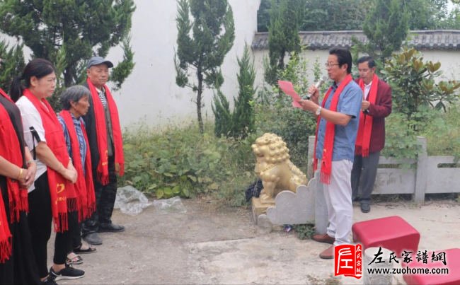 长门大圩支系代表左廷山先生;西北片支系代表左先付先生;西南地支系代表左中军先生;中坝社区支系二十七世孙左兆云先生;老二门支系请谱代表左东片支系二十五世孙左廷改先生;左西片支系二十三世孙左先坤先生;东鲍片支系二十五世孙左姚军先生;西鲍片支系二十三世孙左先胜先生;老三门龚集左庄支系二十四世孙左华金先生;颁谱人与请谱人最后合影留念。