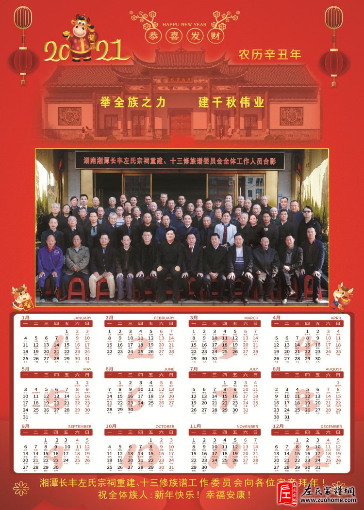 新的一年即将到来,长丰左氏宗祠重建、十三修族谱工作委员会设计制作了一幅以建祠修谱为主题的年画作为新年礼物赠送给全体族亲,以表达对宗亲们的新年祝福!这幅年画,记录和见证了湘潭长丰左氏家族承前启后、继往开来、欣欣向荣、世代辉煌的重要历史时刻和美好愿景,对于家族而言极具非凡的纪念意义和珍藏价值!