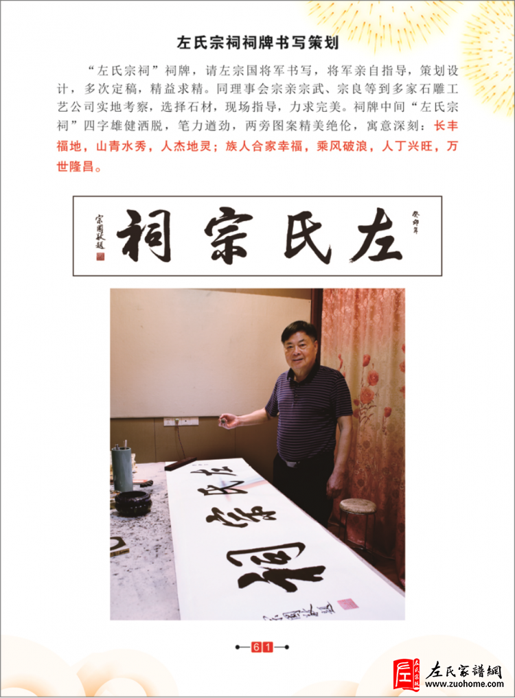 为提升祠堂文化氛围,增加文化色彩,经理事会决定由左靖负责组织,左迪林、左宗良 (市) 左祝美、萧经耀等人,聘请湘潭市民俗专家何歌劲先生及文化名人赵志超先生等实施策划、制作。