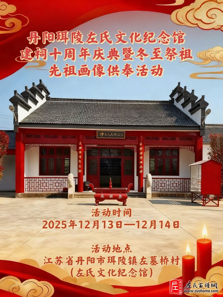 丹阳珥陵左氏文化纪念馆建祠十周年庆典暨冬至祭祖、先祖画像供奉活动通知